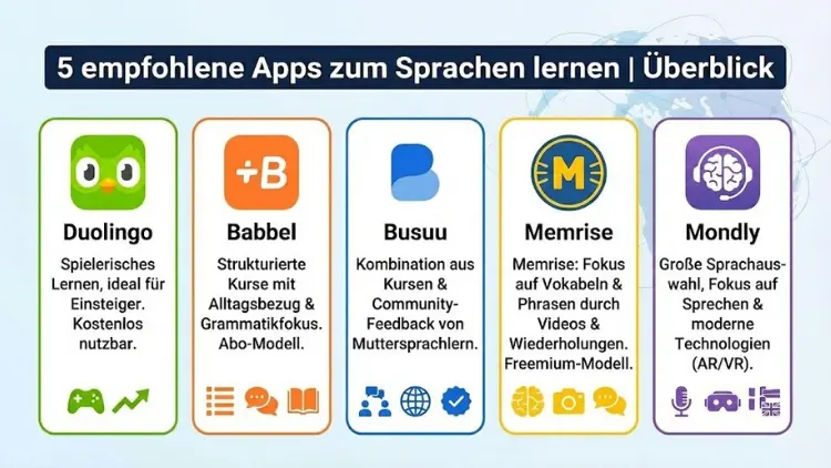Jede der vorgestellten Apps verfolgt einen eigenen Ansatz und eignet sich für unterschiedliche Lernziele. Duolingo überzeugt durch Motivation und einfache Bedienung, während Babbel mit strukturierten Kursen punktet. Busuu bietet durch seine Community-Funktionen einen praxisnahen Mehrwert, Memrise ist besonders stark im Vokabeltraining, und Mondly kombiniert moderne Technik mit interaktiven Übungen.